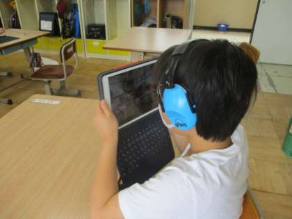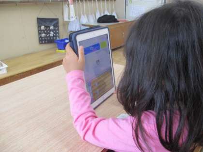 図鑑の作成に,タブレットを使って入力したり,写真を撮ったりしています。