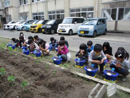 自分だけの鉢に土を入れ,肥料を混ぜ,また土を入れ,人さし指で土に穴をあけ,その中に種を入れて,土をかぶせました。そお後,みんなで「元気に育ちますように」と水をあげました。