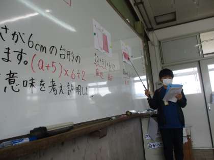 今日は,図を見て式が表す意味を考え,言葉で説明しました。昨日の学習を活かし,文字や×,+,÷の意味を考えることをポイントにして,考えをどんどんノートに書き込んでいました。