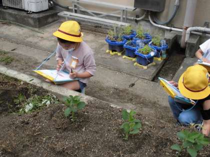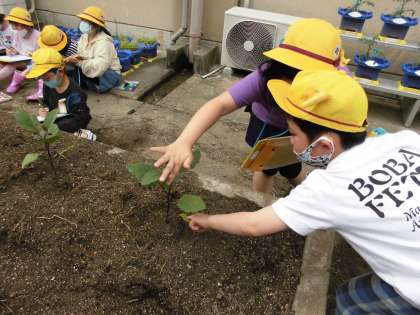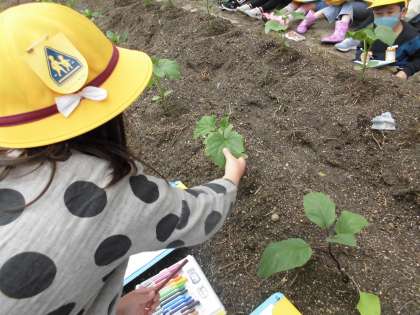 一人一はちのやさいいがいに,やさいを一つえらんで,さいばいをしていきます。はたけにうえられたなえのようすを見て,それぞれのとくちょうに気づき,かんさつをしました。「ナスのなえは,むらさき色をしているよ。」や「キュウリのなえは見たことがあるよ。」「さわると毛がはえてふわふわしているよ。」などいろいろなはっけんをしていました。