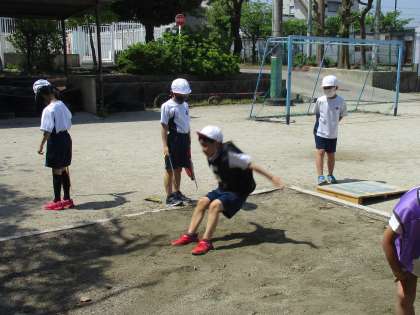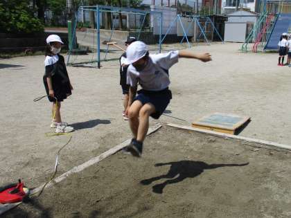 体育の学習ではばとびをしています。リズムよく跳ぶことを意識しながら練習しています。今日は学習して2時間目でしたが,長い距離を跳べる人が増えてきました。