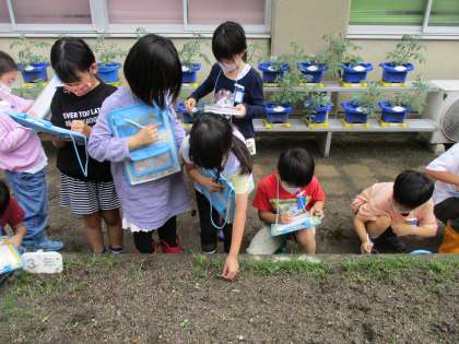 大切に育てている「ヒマワリ」と「ホウセンカ」の芽が出てきたので,観察しに行きました。「2種類の芽は,色が少し違うな。」「触り心地も少し違うよ。」とたくさんの気付きがあったようです。
