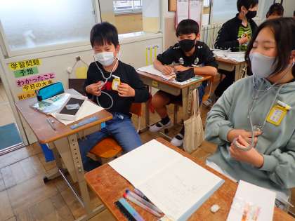 理科の学習では,首などで自分の脈はく数を確かめたり,聴診器を胸に当てて拍動数を数えたりしました。