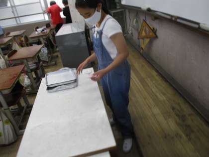 給食の食缶を返却したあと,教室に戻ると給食台が汚れていました。