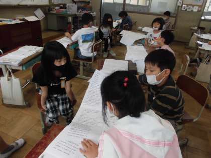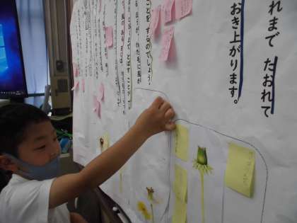 「たんぽぽのちえ」では,「じゅんじょに気をつけて読み,草花のちえブックをつくろう」というたんげんのもくひょうをせっていして,学しゅうをすすめています。全文を見通して読んでいます。たんぽぽのちえの中でいちばんかしこいなと思ったことについて はなしあいました。