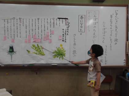 本文が説明していることについて さし絵を指し示しながら音読をしました。説明的文章を読むことの楽しさを味わってほしいと思います。