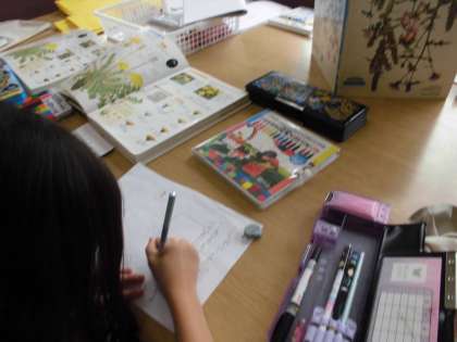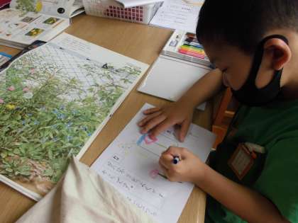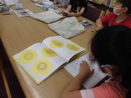「たんぽぽのちえ」を読んだことを生かして「草花のちえブック」をつくります。図書館で草花のちえやそのわけをしらべました。目てきをもってずかんを手にとり,しらべる楽しさをかんじているようすでした。