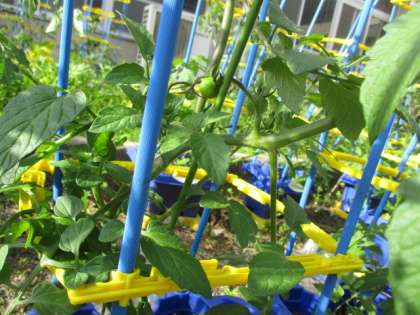 子どもたちの育てているトマトに青い実ができてきました。