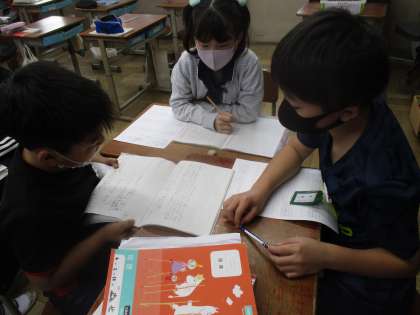 国語では,説明文を読んだ後,筆者の考えに対する自分の考えを発表し合いました。