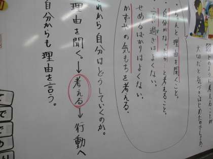 子どもたちは,「理由を聞いてあげればよかった」や「自分がされたらと考えたらいい。」など様ざまな意見が挙がりました。また,中には「理由を聞いて全てを許すわけではなく,本人のために注意する場面も必要。」と本当に相手を思って行動することができました。