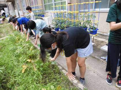 6年生の子どもたちが協力して,草引きをしました。夏に向けて,