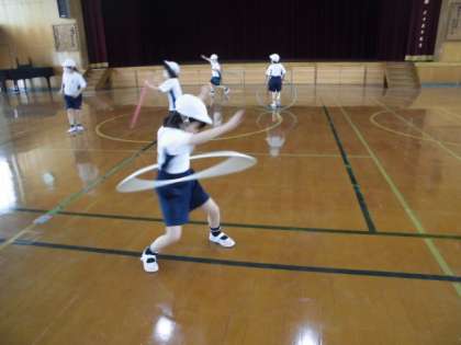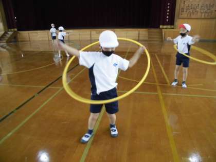 フラフープをつかって,あそびました。さいしょに,きほんのうごきをたいけんしたあとは,じぶんでつかい方やうごきをくふうしました。1じかんの学しゅうのあいだ,ずっとたのしんでいました。