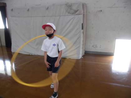 しんぶんしをまるめたぼうやフラフープであそぶじかんをたっぷりとったあと,くふうしたうごきをみんなにしょうかいしました。たのしそうなうごきがいっぱい出てきました。