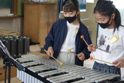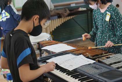 音楽の学習では,それぞれの決めた楽器やパートで練習を頑張っています。難しいところは,友達と教え合いをしながら一生懸命覚えようと練習をしています。