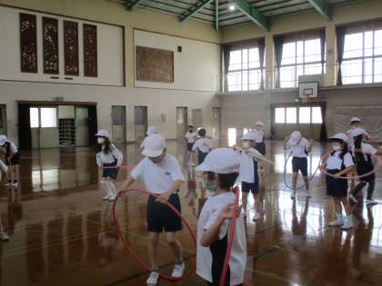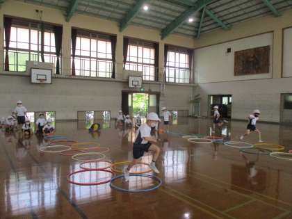 ようぐは フラフープ一つでしたが,まわすだけでなく,そこから,ケンケンパッやなわとびなどいろいろなあそびを することができました。