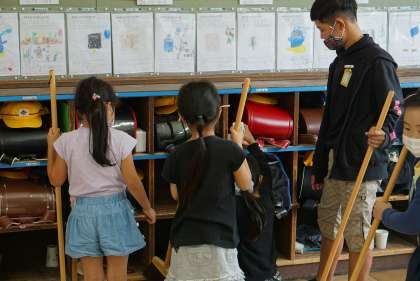 「一列にならんでいくよ」「ぞうきんはこうするんだよ」など,1年生にわかりやすく伝えるように工夫したり,自らお手本となる姿で示したりして一緒に掃除を頑張っています。1年生と接している時の6年生の表情はとても優しく,見ているとこちらまで心が温かくなります。