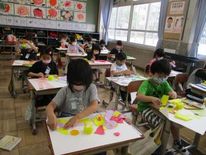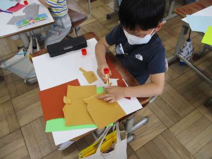 図画工作の学習では,色紙を破いたりちぎったりし,できた紙を並べて何に見えるか考え,作品を作りました。