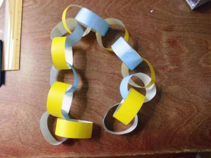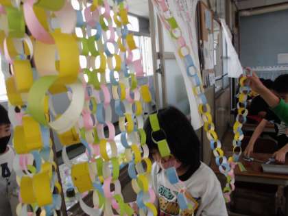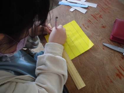 ものさしをつかって,色紙を2センチのはばに切りました。そして,わかざりをつくりました。ものさしを使ってながさをはかったり,ちょくせんをひいたりすることになれ「ながさの学しゅうがたのしい。」「さんすうってたのしい!」とかんじてくれたようです。