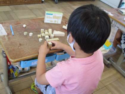 算数科「いろいろなかたち」の学習では,つみきを使って,それぞれの形の特徴を活かし,いろいろなものを作ってみました。