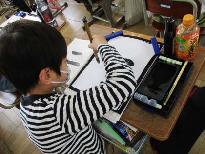 今日は横画の筆つがいに気をつけながら「二」という文字を書きました。力の入れ方,文字のバランスに気をつけて力強い字を書くことができていました。