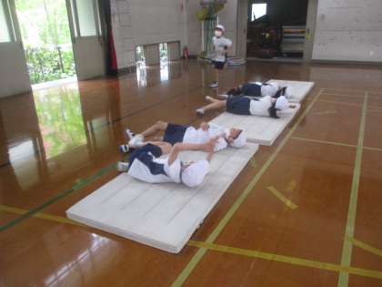 リーダーのまねをして用具を飛び越えたり,くねくね進んだり,マットに転がったりとたくさん工夫して活動していました。