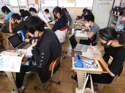 社会科の「震災復興の願いを実現する政治」の学習では,GIGA端末や教科書を使って,被災地の「課題」と「これからのまちづくり」について調べています。