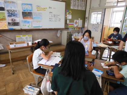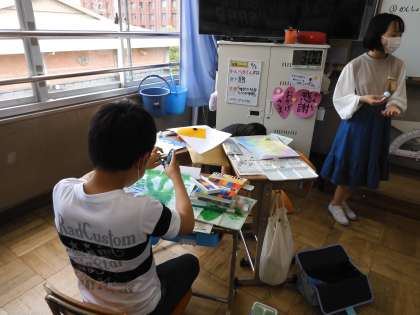 教室のホワイトボードに次々に貼られていく作品をみて,