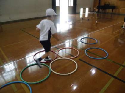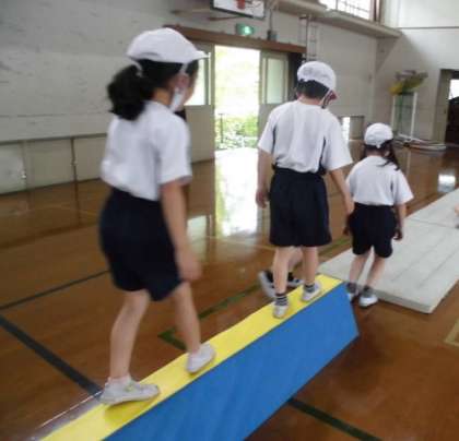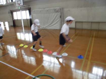 コーンや,ケンステップ,マットなどのばをつくり,まねっこあそびをしました。3人グループでかつどうしました。リーダーのうごきをまねてすすんでいきます。いろいろなくふうしたうごきがうまれました。