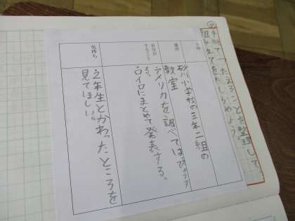 お世話になっている先生に頑張っている姿を見に来てもらうために案内のお手紙を書いています。「2年生の担任の先生に成長した姿を見てほしいな。」「タブレットを使って調べ学習する様子を見てほしい!」と手紙に書きたいことを考え,構成を考えることができました。