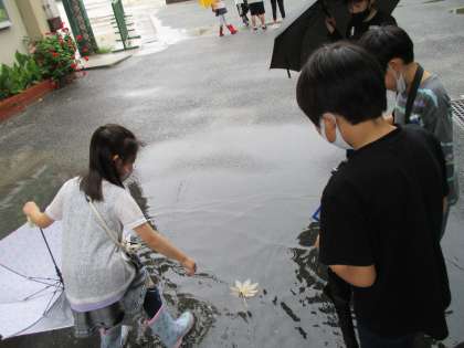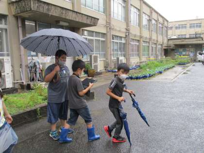 6月ってどんなイメージだろう?色は?形は?とそれぞれがイメージする6月をイメージマップで広げて考え,その後タブレットを使って6月を感じるものを探しに行きました。「水たまりに浮かぶ葉って6月っぽいかな。」「あじさいもいいな。」とタブレットを使って写真を撮ることができました。