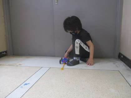 「10cmゴムを伸ばすと,ここまで進んだよ!!」「どうやったら,もっと遠くまですすむかな。」