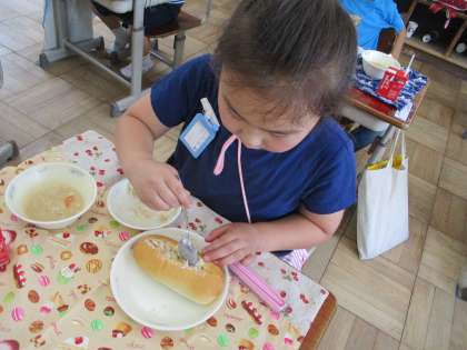 ツナサンドの具にマヨネーズを自分の好きな量を混ぜて,コッペパンにスプーンで切れ目を入れ,その中に具を入れれば,ツナサンドの完成です。