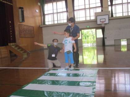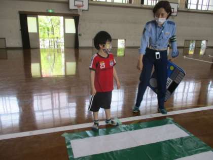 警察官の方に来ていただき,自分のまわりの安全を一度立ち止まってかくにんしてから,進むことを学び,体育館でじっせんしました。