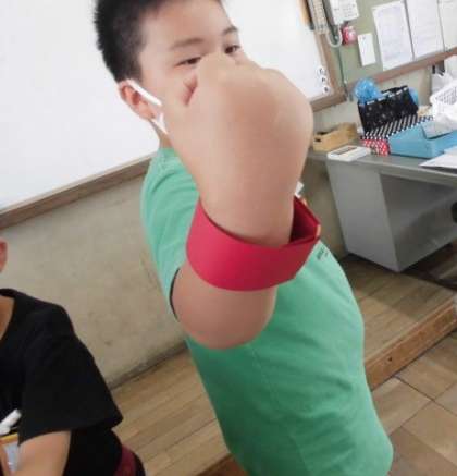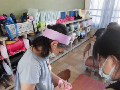 ほそながい色がようしをつかってわをつくりました。ホッチキスやセロハンテープ,わゴムをつかった作り方をたしかめたあと,いろいろな大きさのわをつくってみにつけてみました。つぎのじかんにかざりをつけていきます。