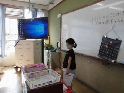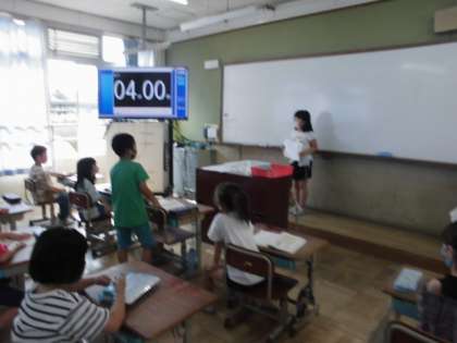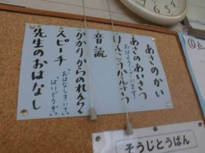 朝の会で,日直のスピーチを続けています。朝のスピーチのためにしっかり考えてじゅんびをしてきているようすです。いっしょうけんめいなスピーチがおわるとみんなでしつもんをしたり,かんそうをこうりゅうしたりしています。じぶんのおもいやかんがえをていこうなくつたえられるようになっていってほしいとおもいます。