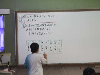 今日は数字を位ごとに分けて,整理していきました。それぞれ,何を何個合わせた数なのかを考えて発表することができていました。