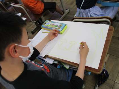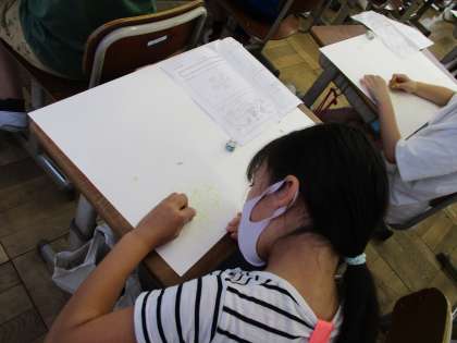 今日はアイデアスケッチをもとに,画用紙に下描きをしました。「かえるってどんな体をしているのかな。」「頭と体のバランスを考えて,人を描こう。」など,思い思いに描くことができていました。次の時間は,いよいよ絵の具で色をつけていきます。
