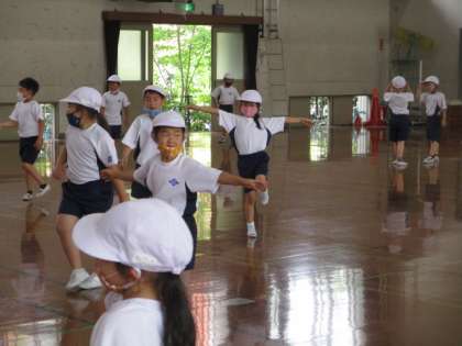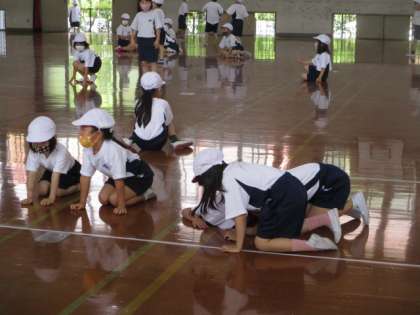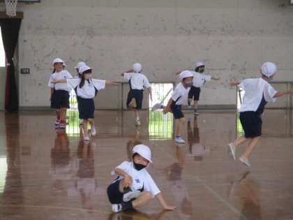 体育「むしになって」の学習では,音楽に合わせて,ありやはち,ちょうちょうになりきって楽しく動きました。