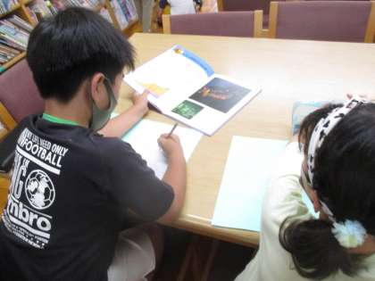 図書室で調べる子どもとPCで調べる子どもと別れて調べました。