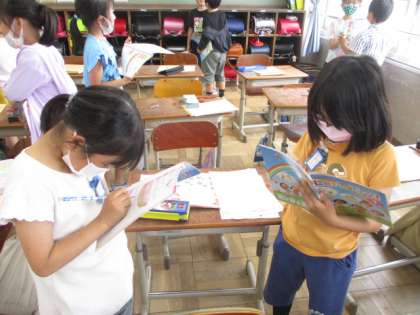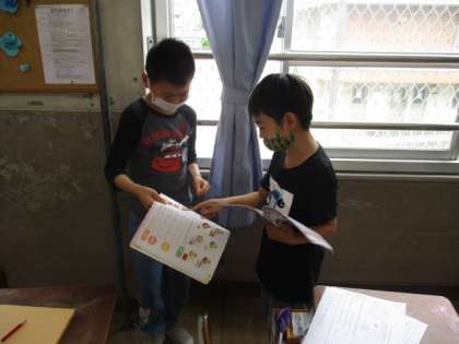 外国語活動の時間では,1から20までの数字を学習しました。色を塗ったリンゴの数を英語でたずね,同じ数のお友達を積極的に探す姿がみられました。