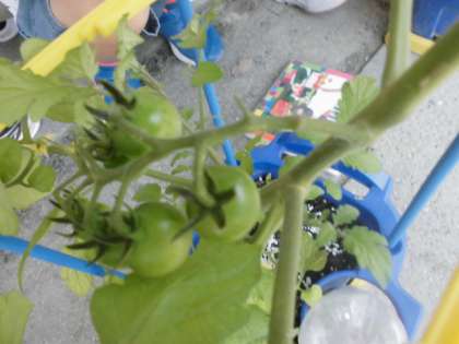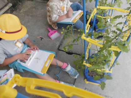 ミニトマトのみが大きくなってきました。畑のサツマイモやジャガイモもたくましく成長しています。かんさつをする子どもたちもうれしそうです。