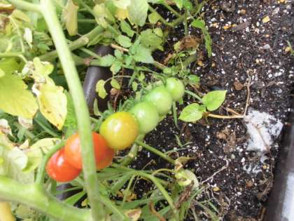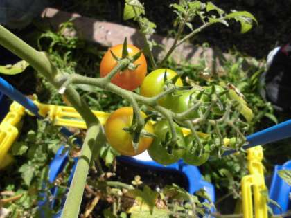 ミニトマトのみがすこしずつ,赤くなってきました。ひとつひとつのみが,とてもきれいでほうせきのようです。はちでそだてているので,たくさんのしゅうかくはできませんが,ひとつひとつだいじにしゅうかくしたいと思います。子どもたちもあさからねっしんに水やりをしています。