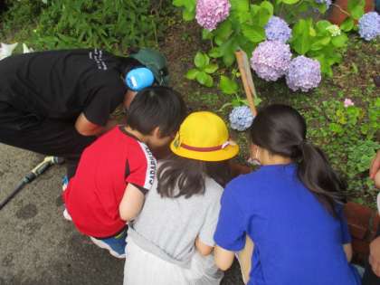 「あじさいって,どんないろかな?」「あじさいって,どんなかたちかな?」と,みんなきょうみしんしんでみていました。