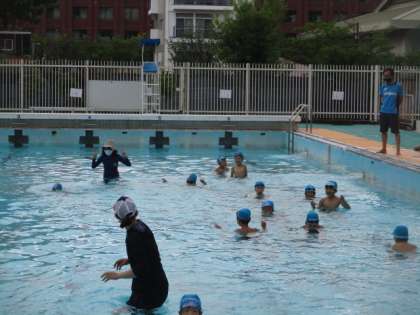 今日は,先週より水の量を増やして水遊びをしました。顔をつけたり,鼻から息を出したりしました。水中じゃんけんもしました。来週も頑張りましょうね。