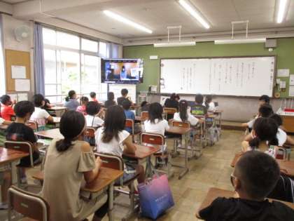 始業式が始まると みんな画面に注目してお話を聞いていました。