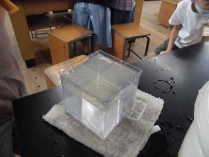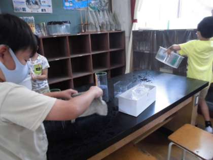 1リットルが10デシリットルであることを学習し,実際に水をはかって確かめました。最後には水そうの水が何リットルくらい入っているのかを予想し,水の量をはかってみました。たくさんの水を使うので理科室で学習をしました。後片付けもがんばっていました。