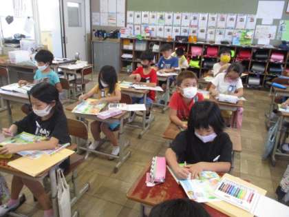 外国語活動の学習で,「I like〜」という表現を使って,自分が描いた虹を紹介する活動をしました。みんな,自分の好きな色を選んで虹に色を塗っていました!