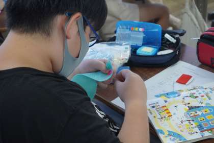 今回,初めてさいほうセットを使って,まだまだ慣れていない状態の子ども達ですが,学んだことを実際に取り組みながらできるようになっています。