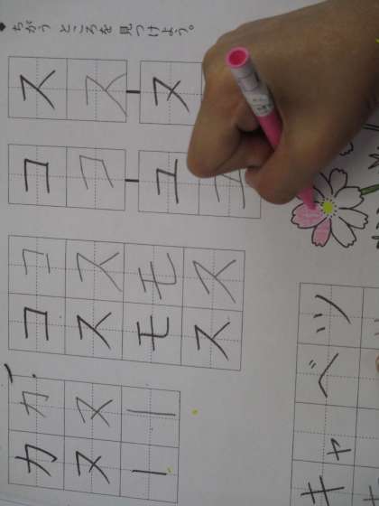 かくの方向に気を付けることで,「マ・ア」「シ・ツ」など,にているカタカナもしっかり区別をつけて,書くことができていました。