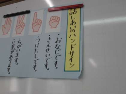 国語で,道案内の仕方について話し合いました。話し合う前に,話し合いのハンドサインを確認しました。いろいろな意見をつなげ,話し合ったことで,考えを広げたり,深めたりしていってほしいと思っています。